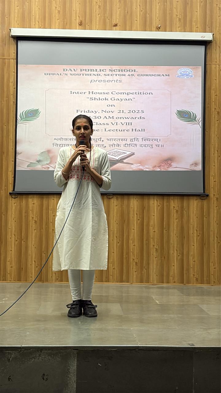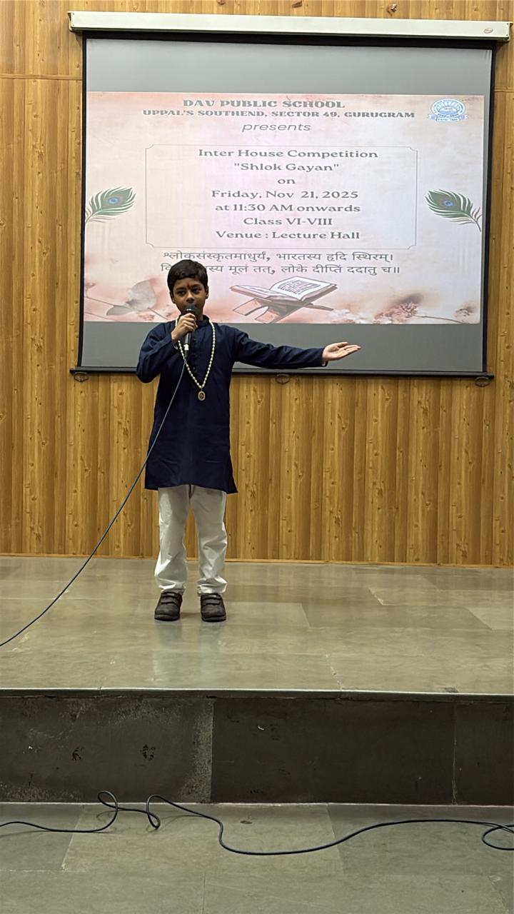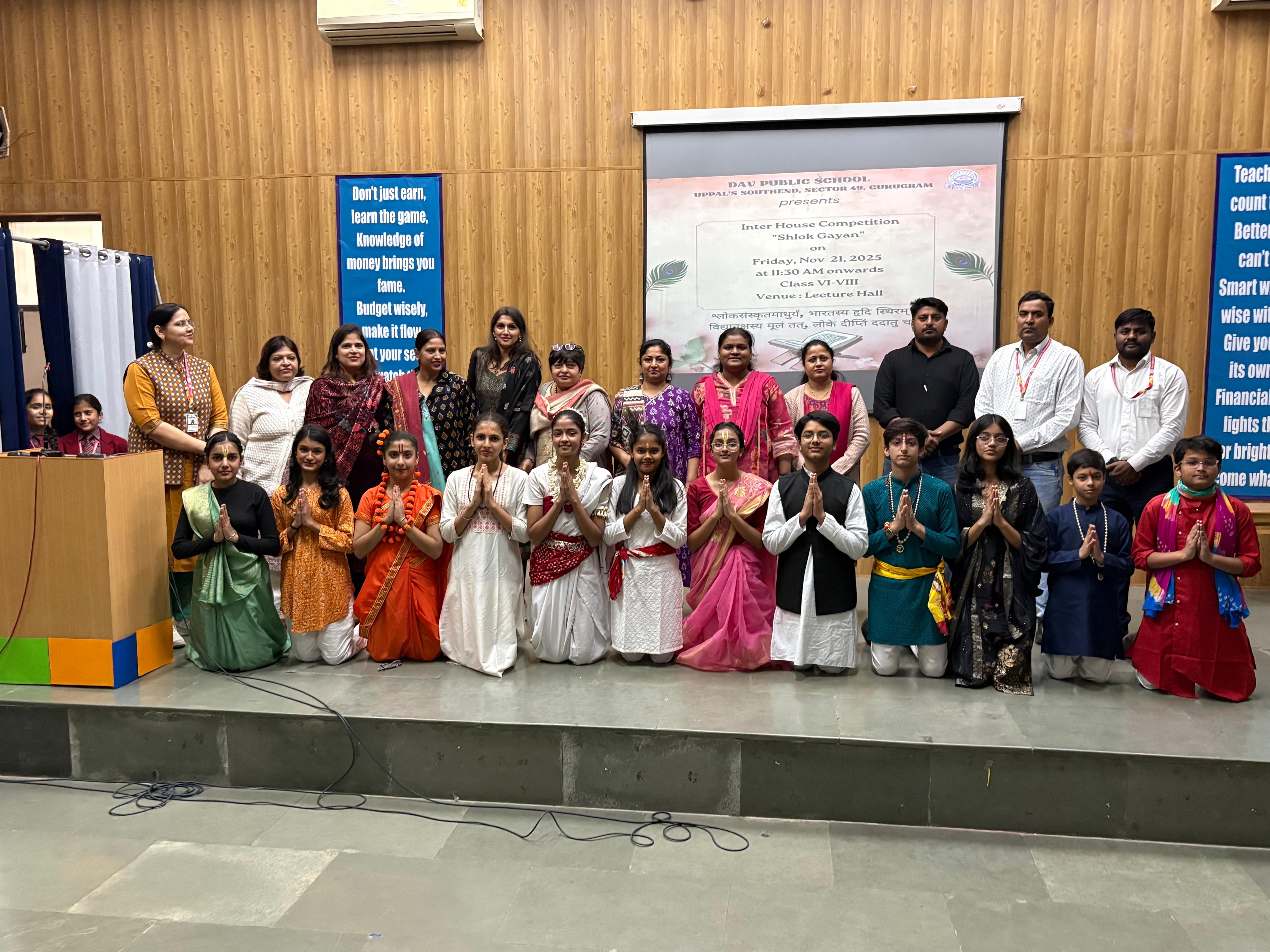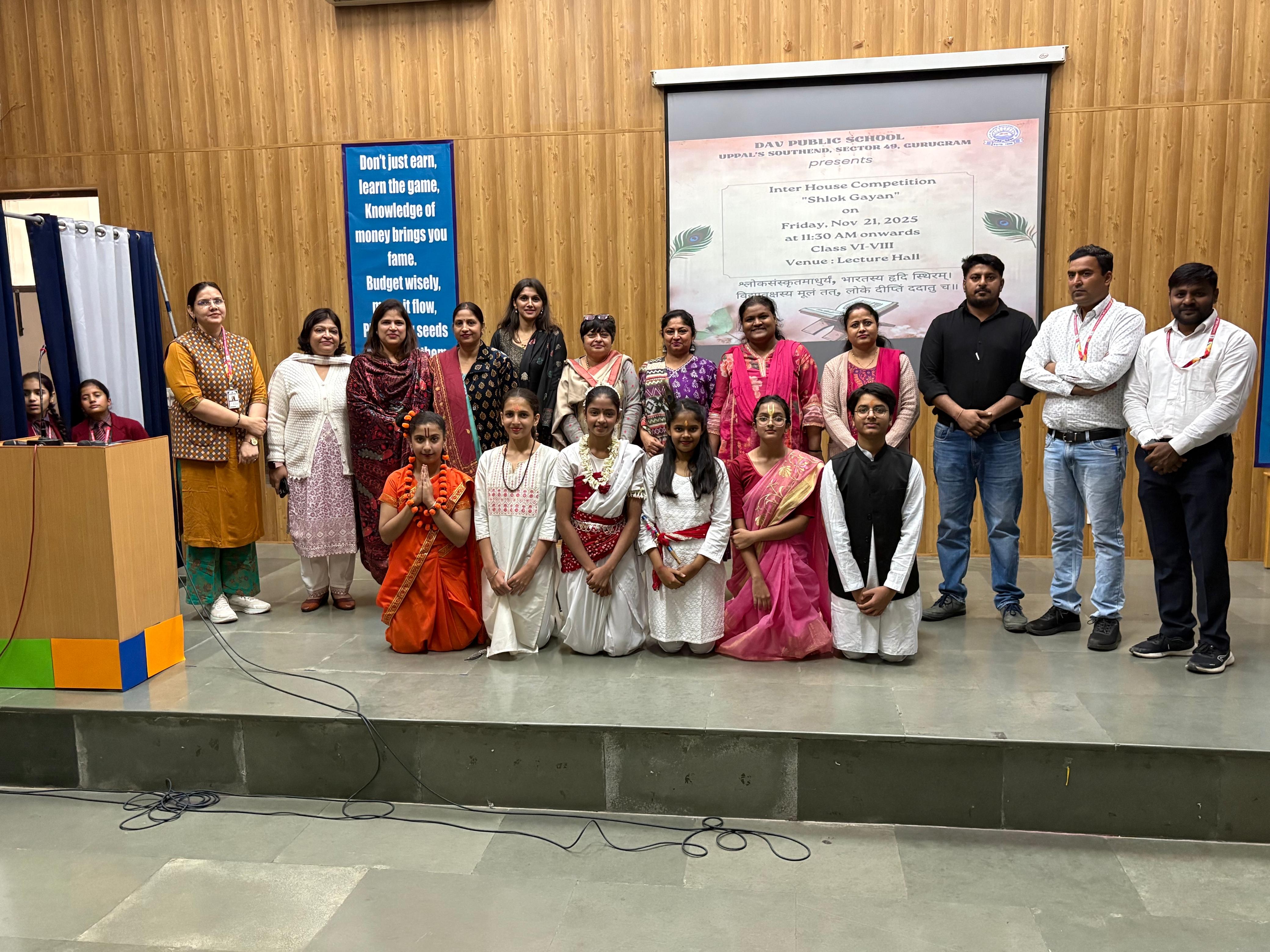 DAV Public School, Uppal’s Southend, Sector-49, Gurugram organised the Inter-House Shlok Gayan Competition for students of Grades on 21 November 2025. The event aimed to promote Sanskrit learning and encourage students to understand and internalise value-based teachings conveyed through meaningful shlokas.