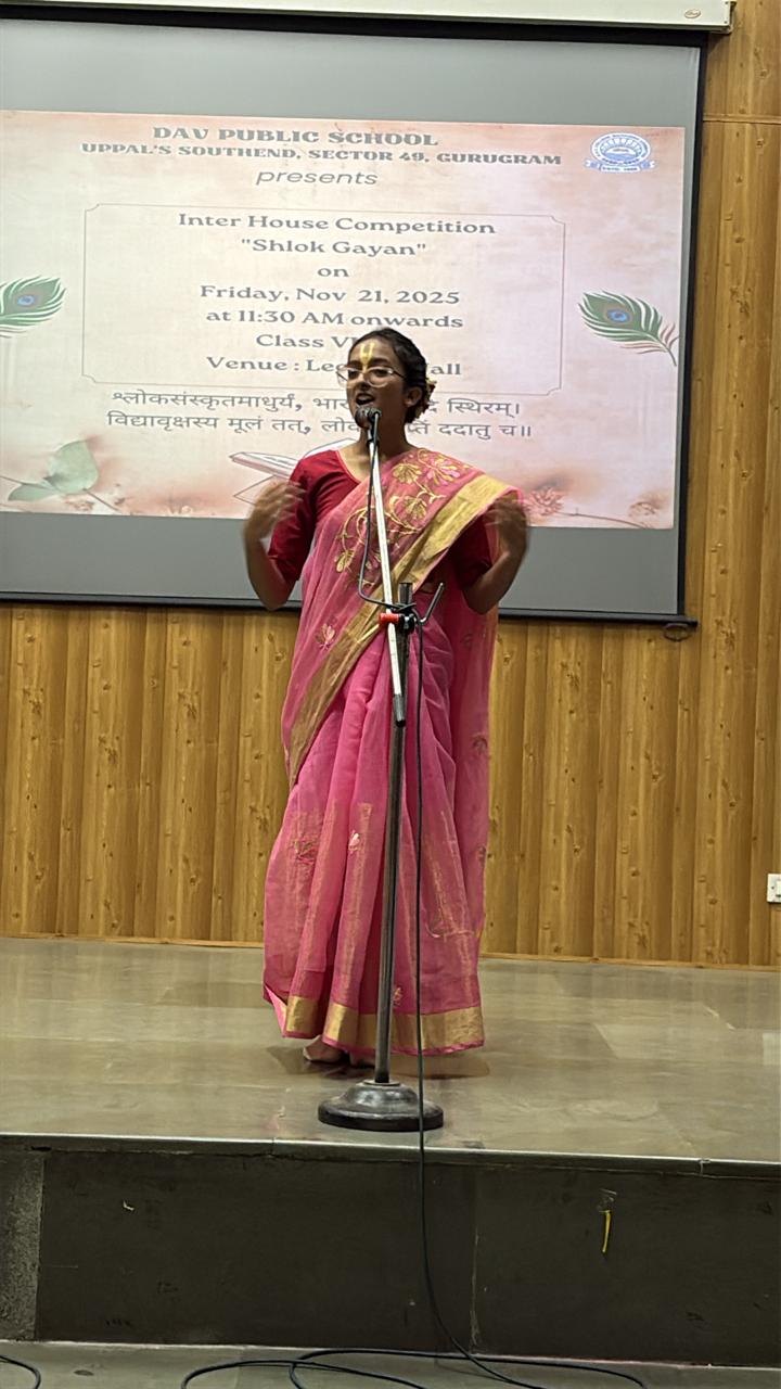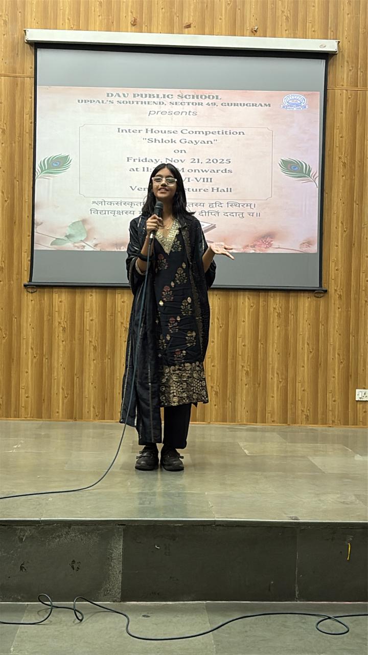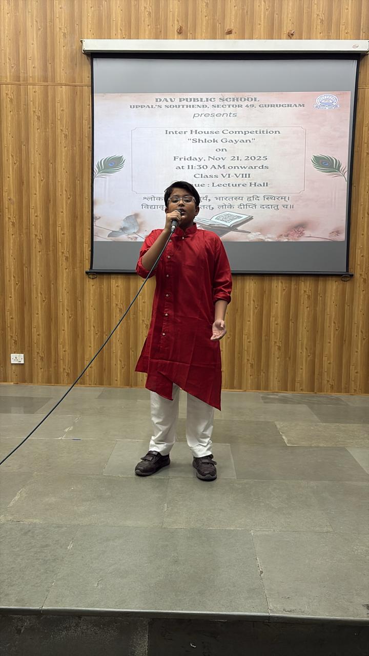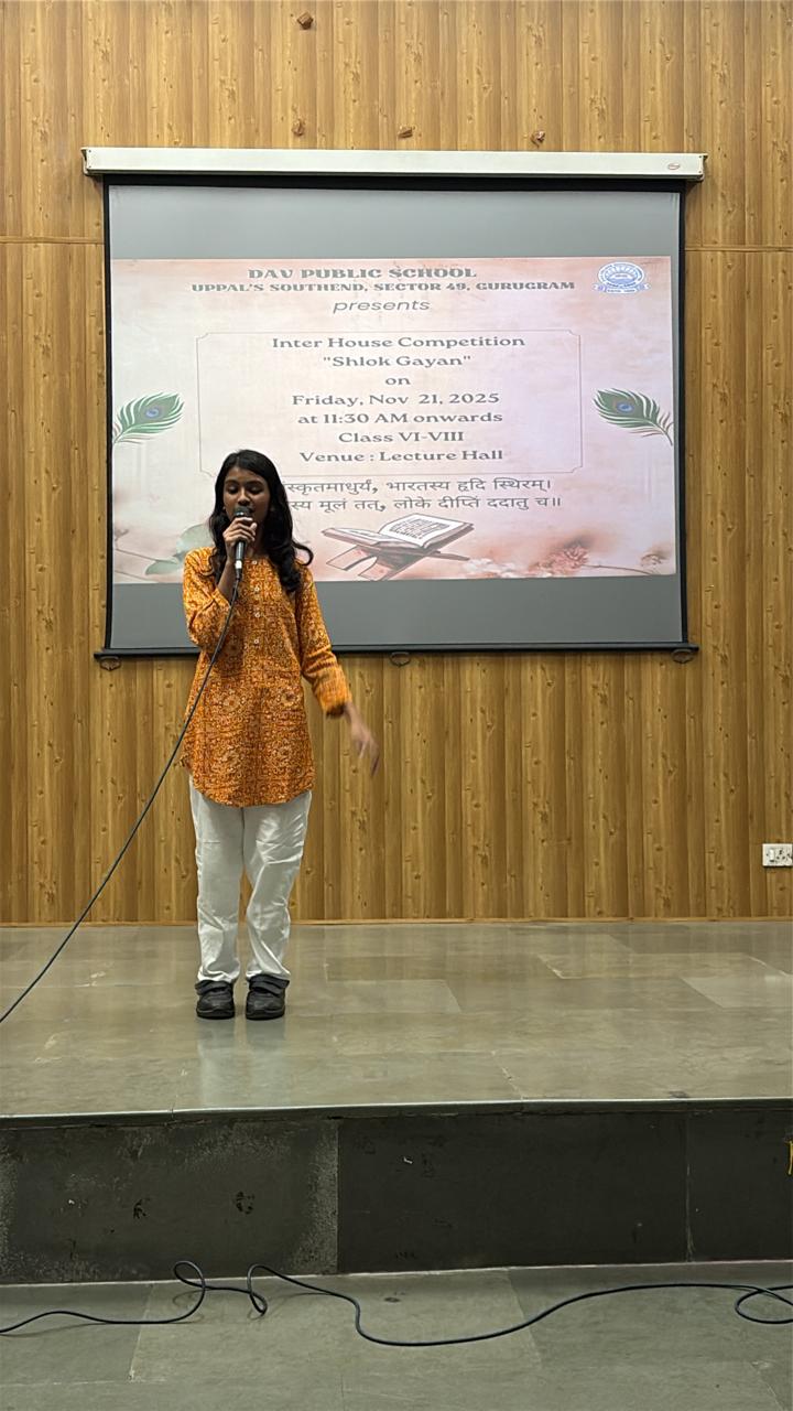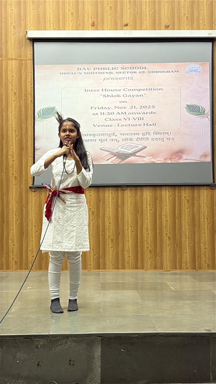 DAV Public School, Uppal’s Southend, Sector-49, Gurugram organised the Inter-House Shlok Gayan Competition for students of Grades on 21 November 2025. The event aimed to promote Sanskrit learning and encourage students to understand and internalise value-based teachings conveyed through meaningful shlokas.
