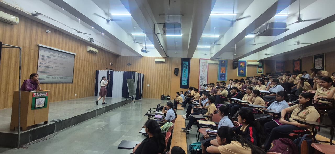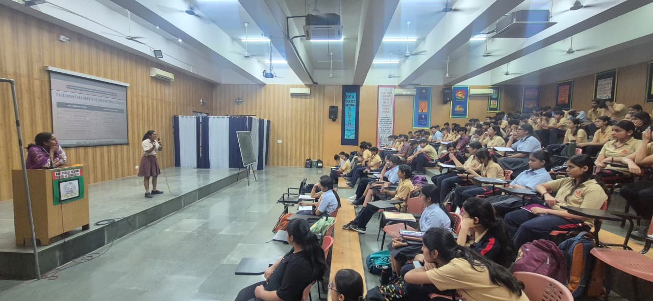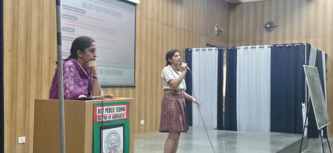 An orientation session for the upcoming Inter-House Parliamentary Debate Competition was conducted on 9th April 2026 for the students of Class XI at DAV Public School, Sector-49,Gurugram. The session was facilitated by Ms. Meenakshi, PGT Political Science, along with her team of Class XII students, Tanishka (XII-F) and Hanu (XII-F), who guided the participants on the format, rules, and expectations of a parliamentary-style debate.