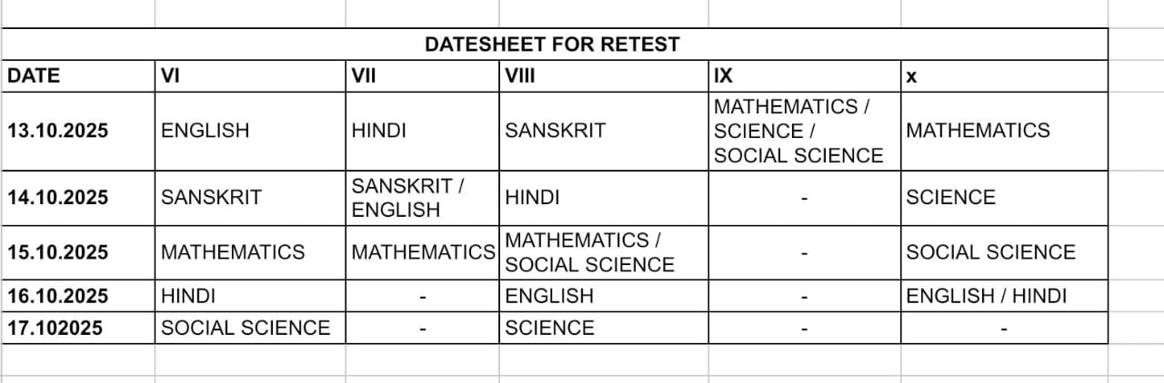 RETEST DATESHEET FOR MID TERM EXAMINATION 2025